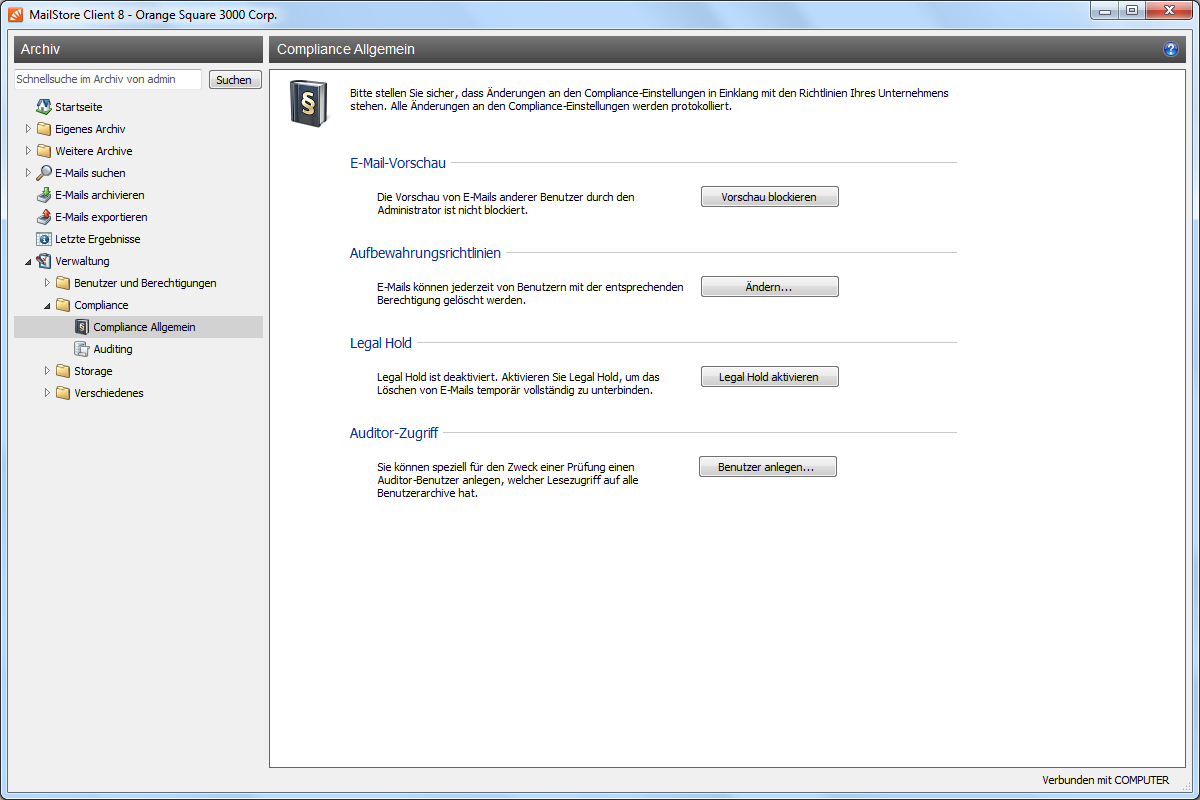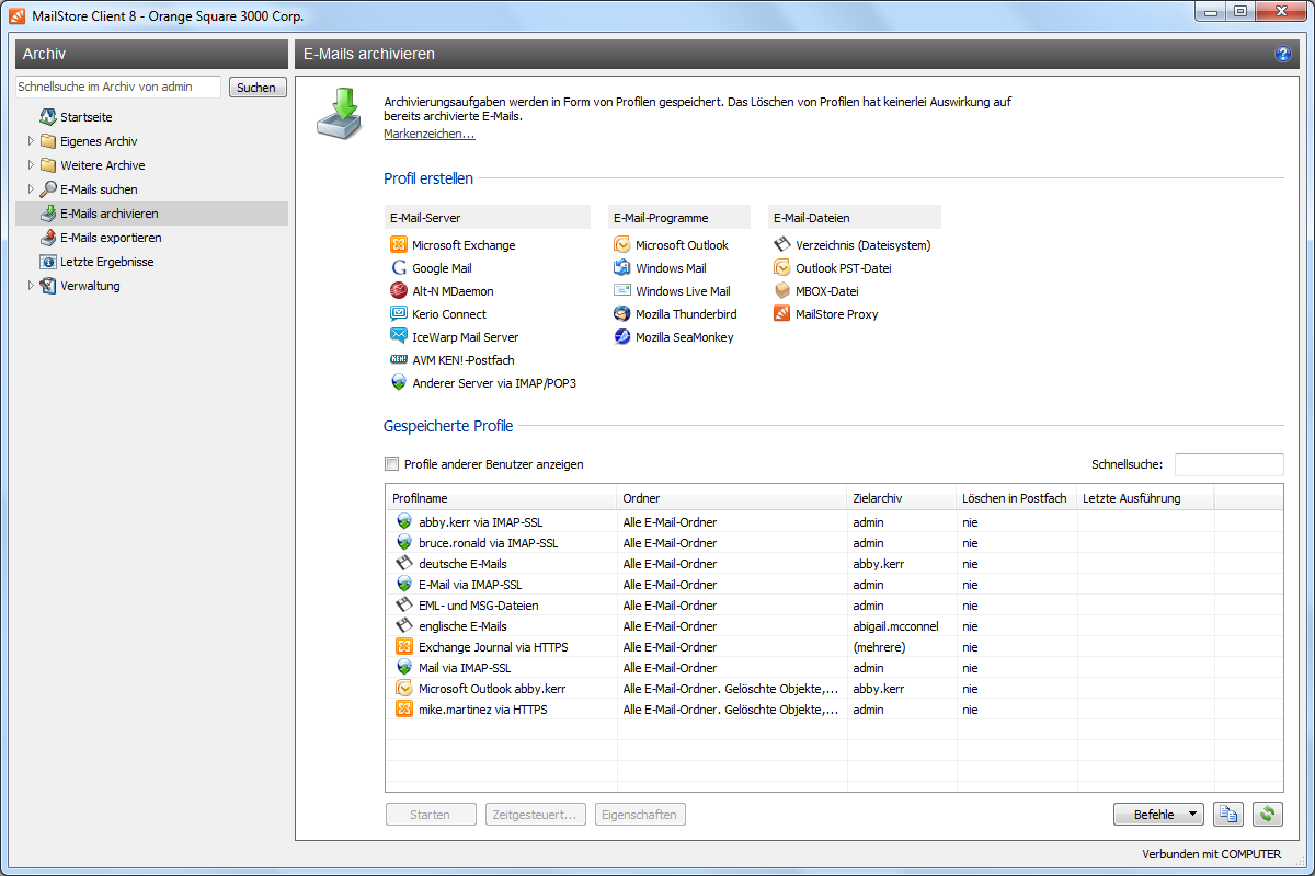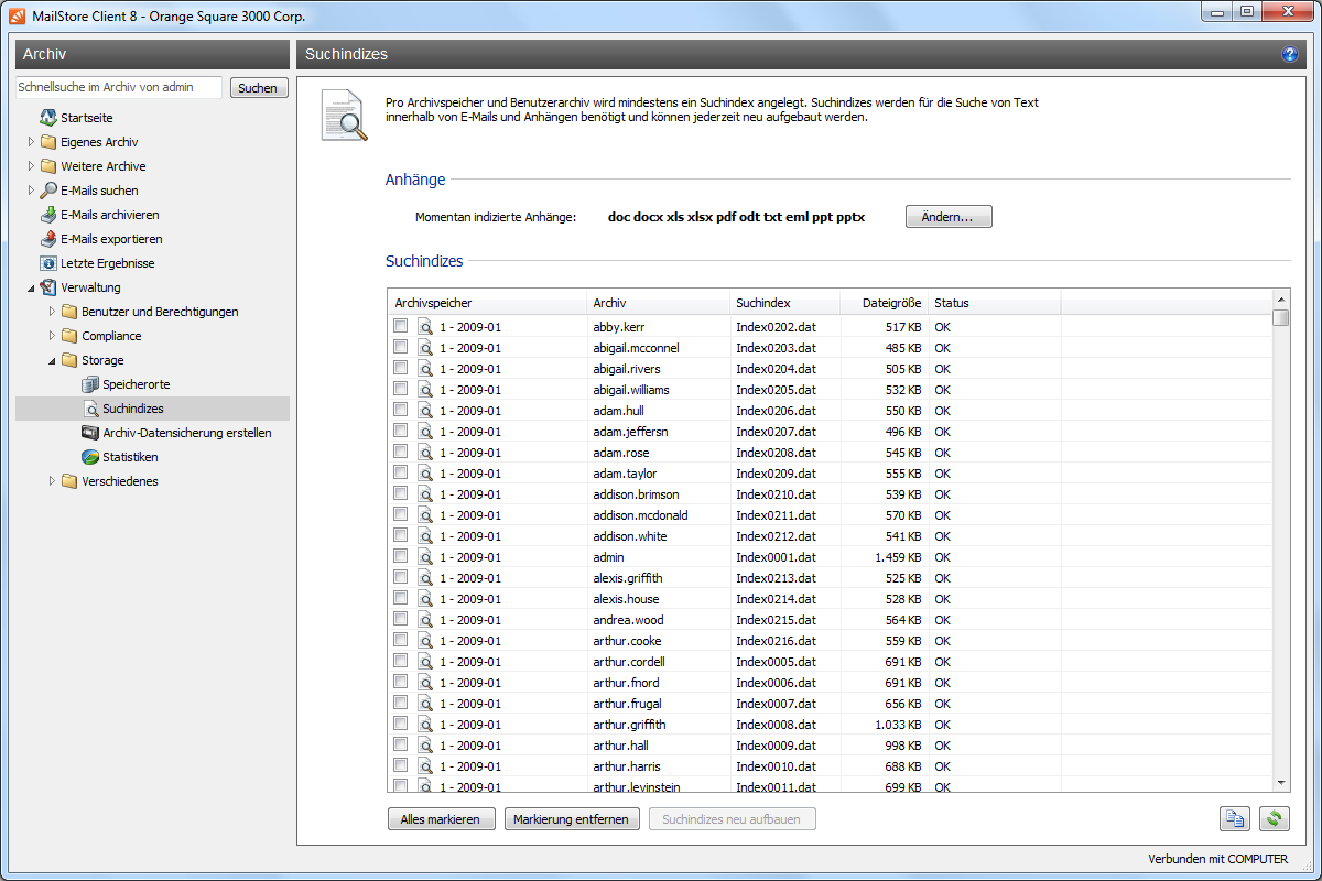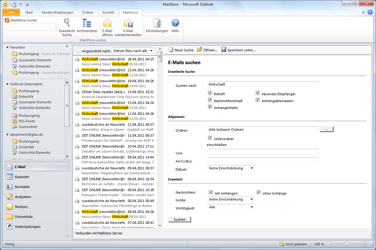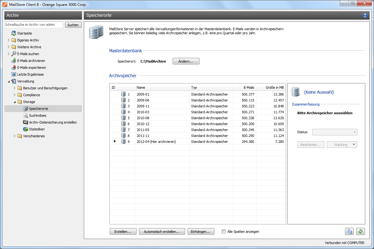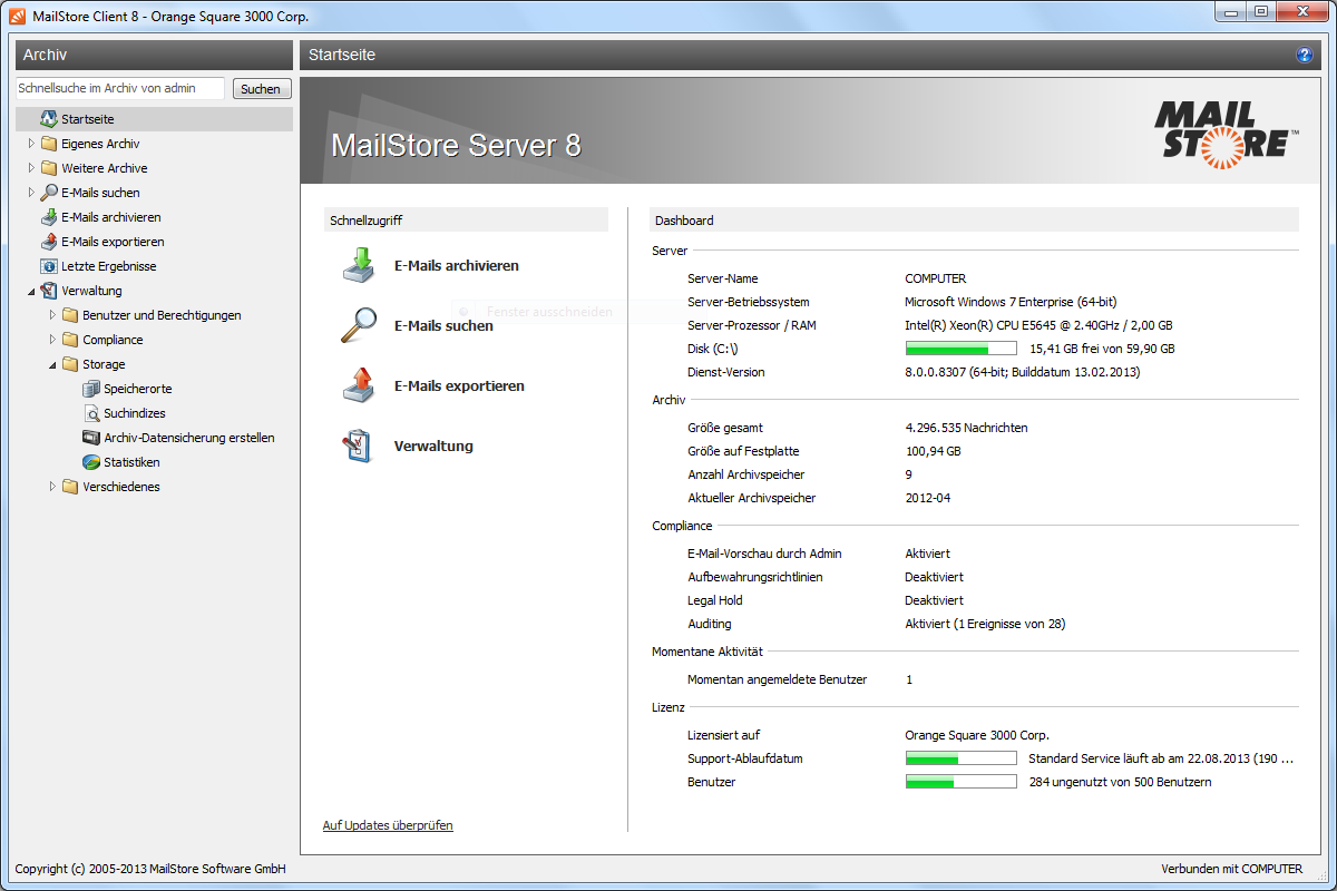 E-Mail-Archivierung für Unternehmen MailStore Server MailStore Server, mittlerweile in Version 8.1.2 verfügbar, hat sich über viele Jahre hinweg und durch den erfolgreichen Einsatz bei über 20.000 Kunden zu einem weltweiten Standard für die E-Mail-Archivierung in Unternehmen entwickelt. Einfach zu installieren und in jeder Situation absolut zuverlässig. |