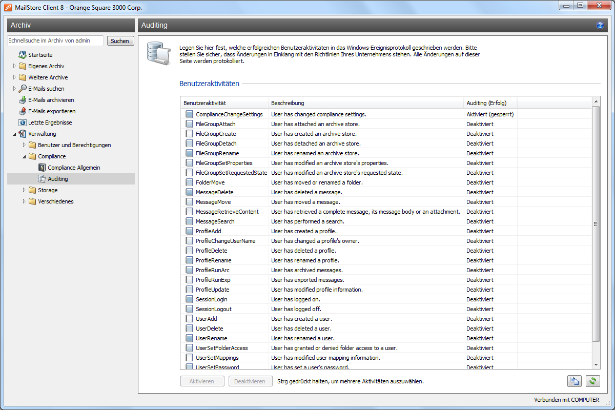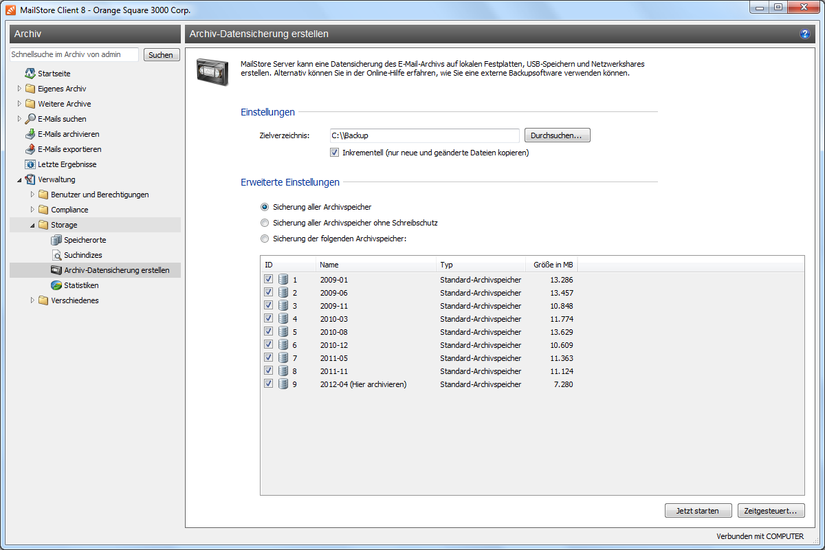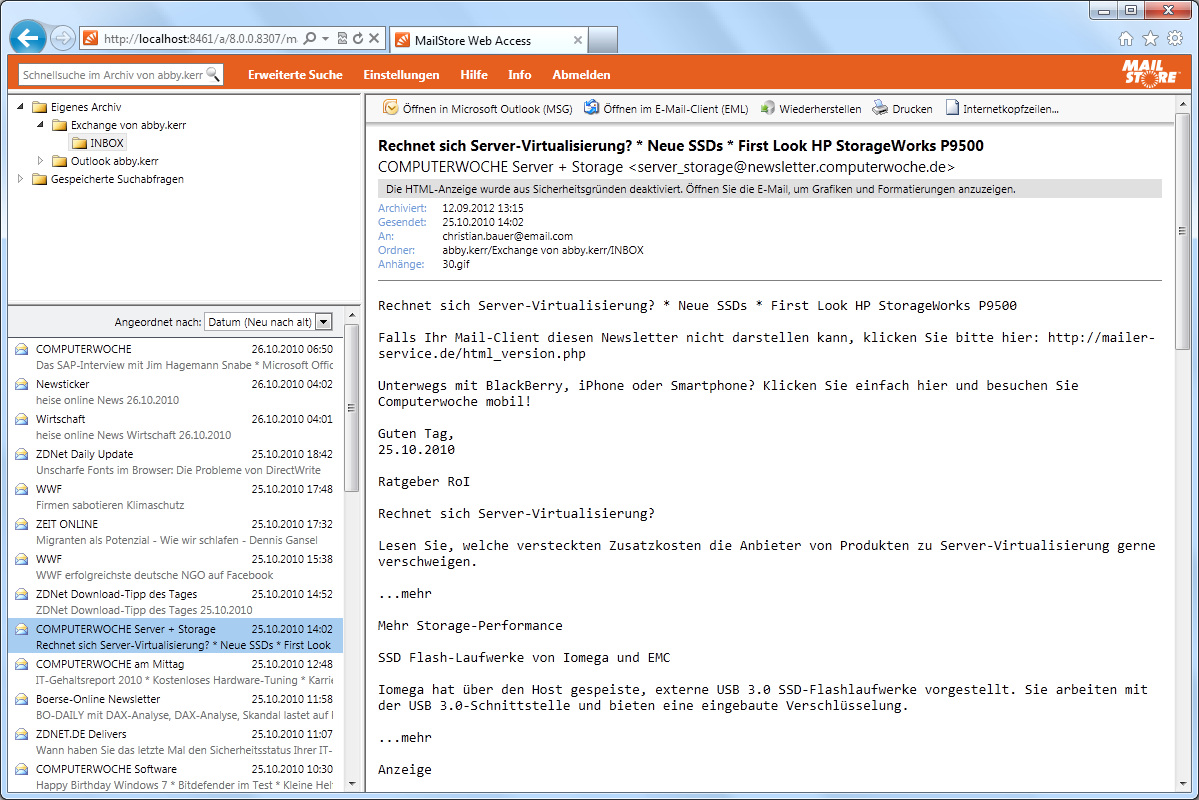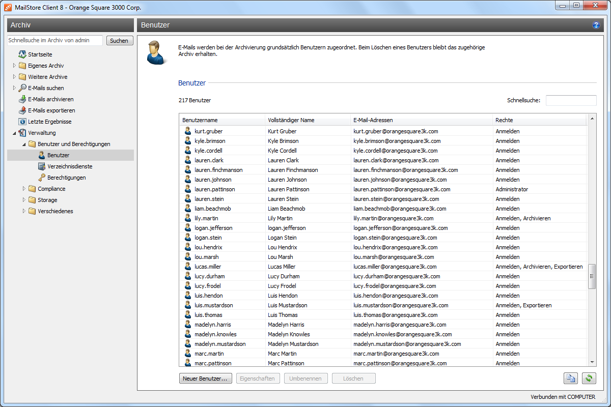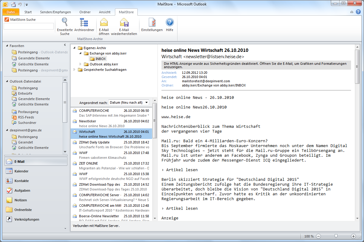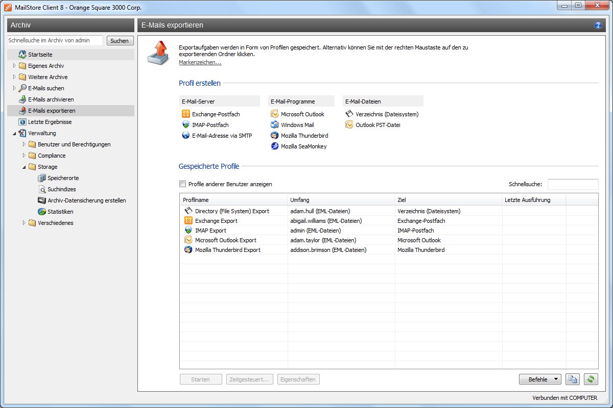 E-Mail-Archivierung für Unternehmen MailStore Server MailStore Server, mittlerweile in Version 8.1.2 verfügbar, hat sich über viele Jahre hinweg und durch den erfolgreichen Einsatz bei über 20.000 Kunden zu einem weltweiten Standard für die E-Mail-Archivierung in Unternehmen entwickelt. Einfach zu installieren und in jeder Situation absolut zuverlässig. |
